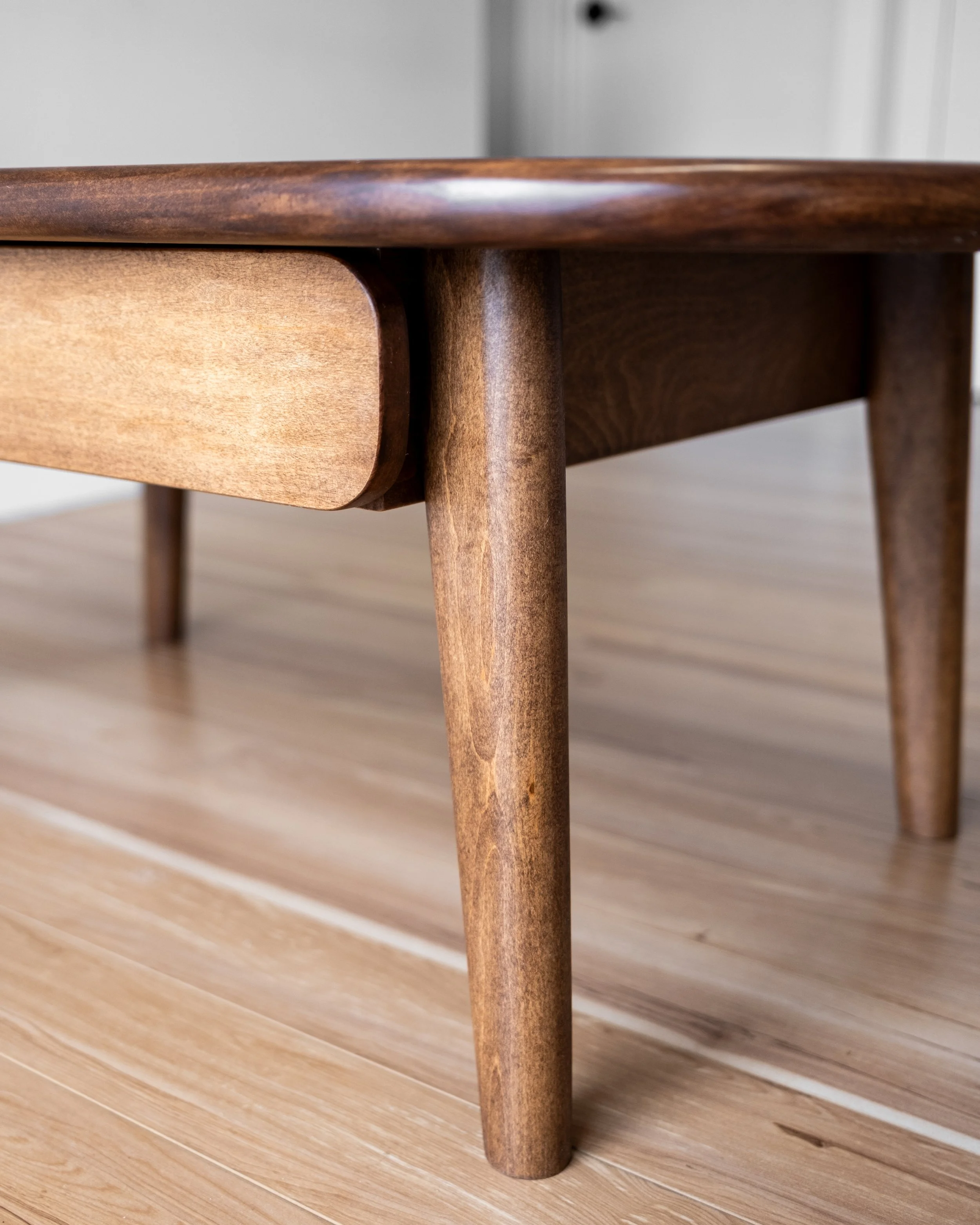 Les détails qui font la différence : pieds fuselés légèrement inclinés, lignes nettes et un tiroir sans poignée visible.